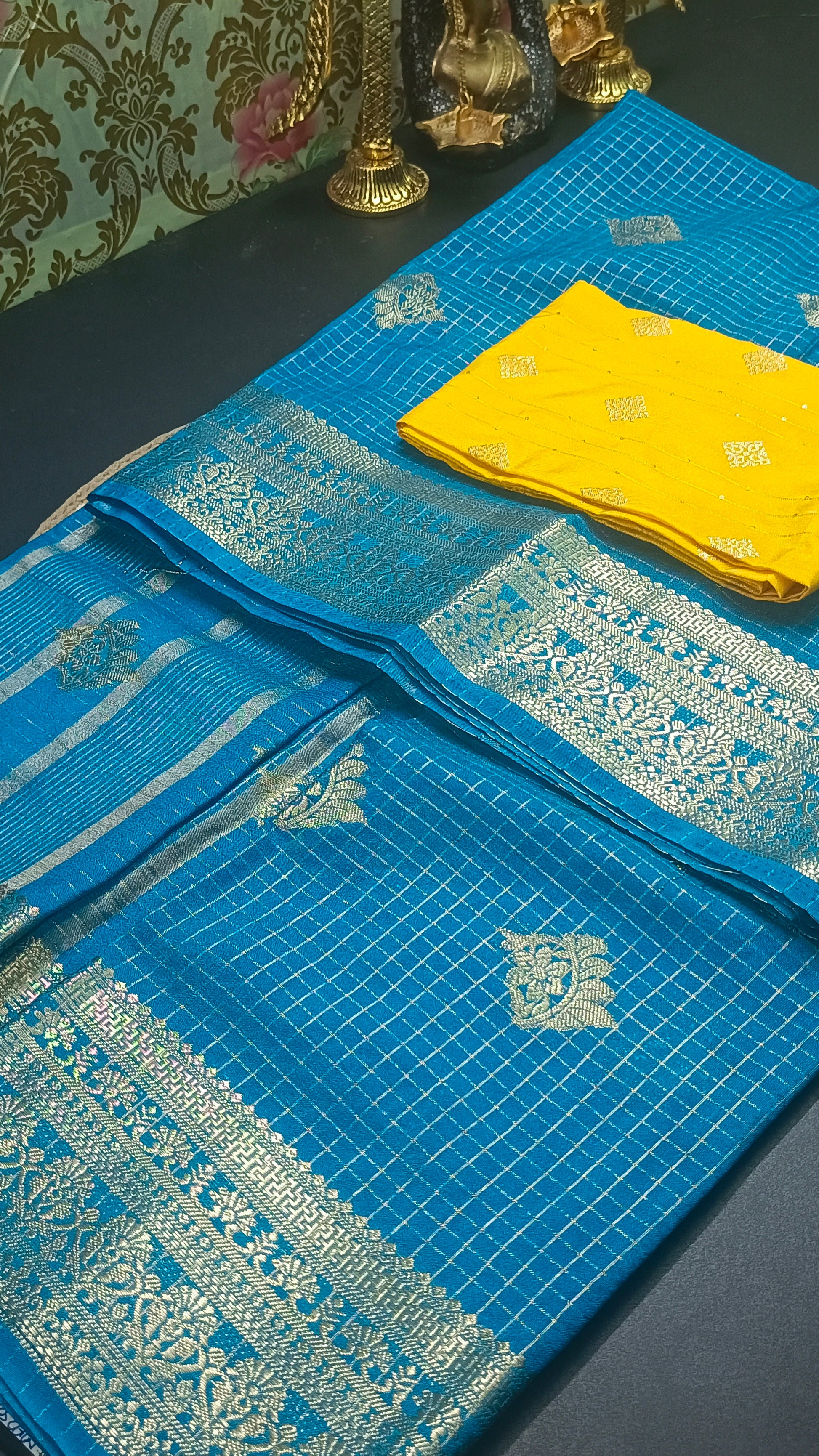 The Jaalika Vegan Viscose Georgette Saree is a graceful drape featuring delicate small zari checks across the body, elevated with a rich zari weave pallu. Paired with a contrast designer blouse enhanced with sequins, this saree blends subtle charm with festive opulence.