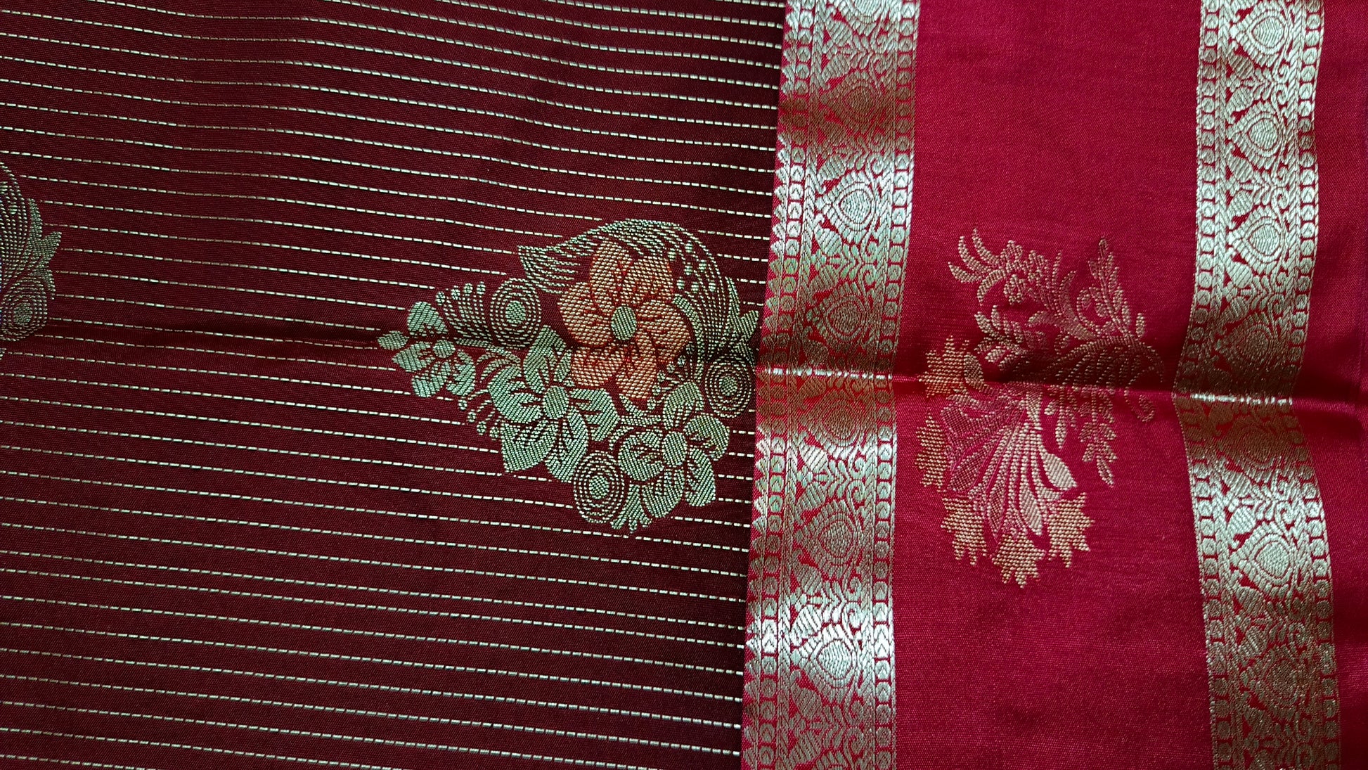 Brown with red Parijatham Vegan premium kanchi brocade silk saree LA25931