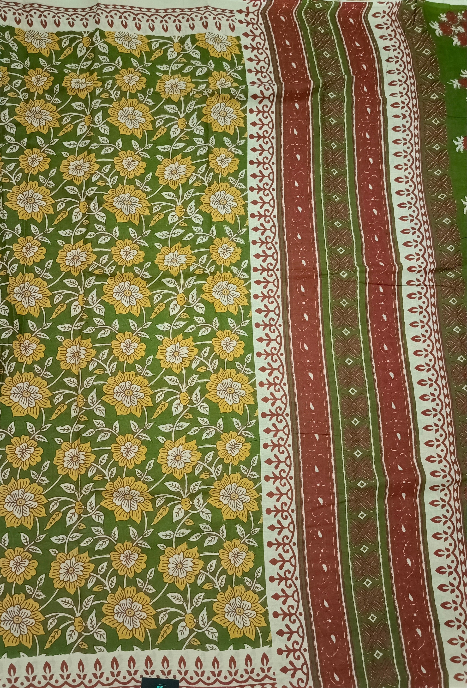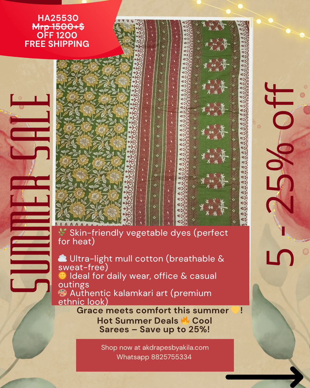Green kalamkari floral veg dye mull cotton saree HA25530