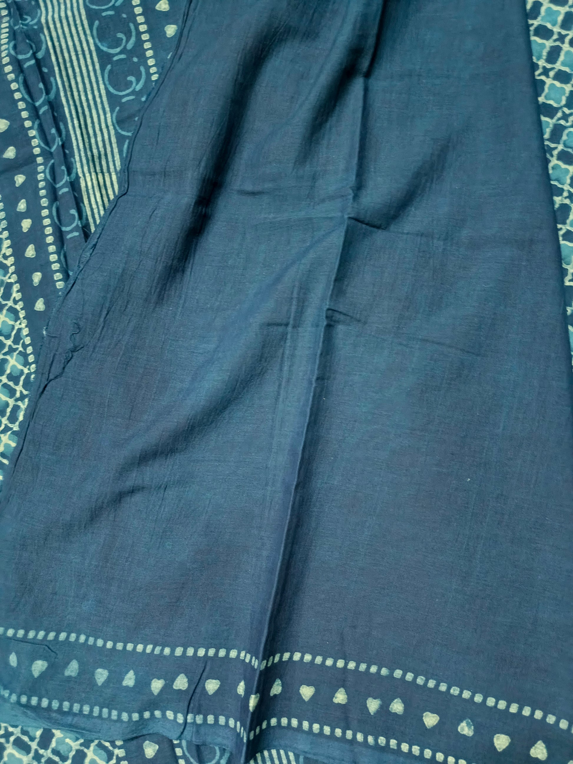 Crafted from ultra-soft mull cotton blended with sustainable bamboo fibre, this saree feels incredibly light and breathable on the skin—perfect for all-day wear. The rich indigo hue brings a timeless, earthy elegance, while the subtle border detailing adds just the right touch of sophistication.