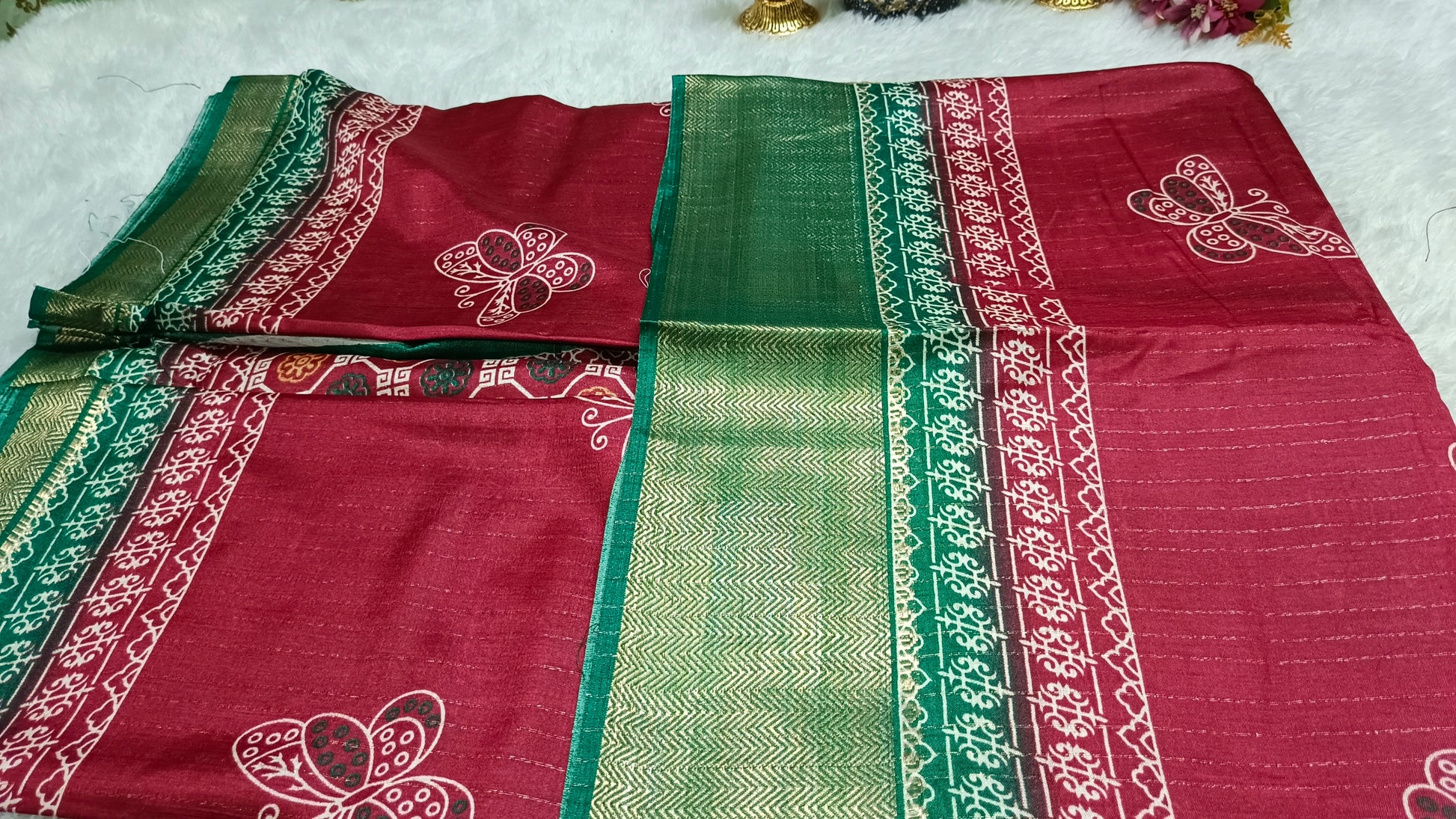 An elegant semi dola saree featuring a graceful butterfly-inspired design with a digitally printed pallu, complemented by a contrasting blouse. A versatile drape that blends subtle sheen with contemporary charm.