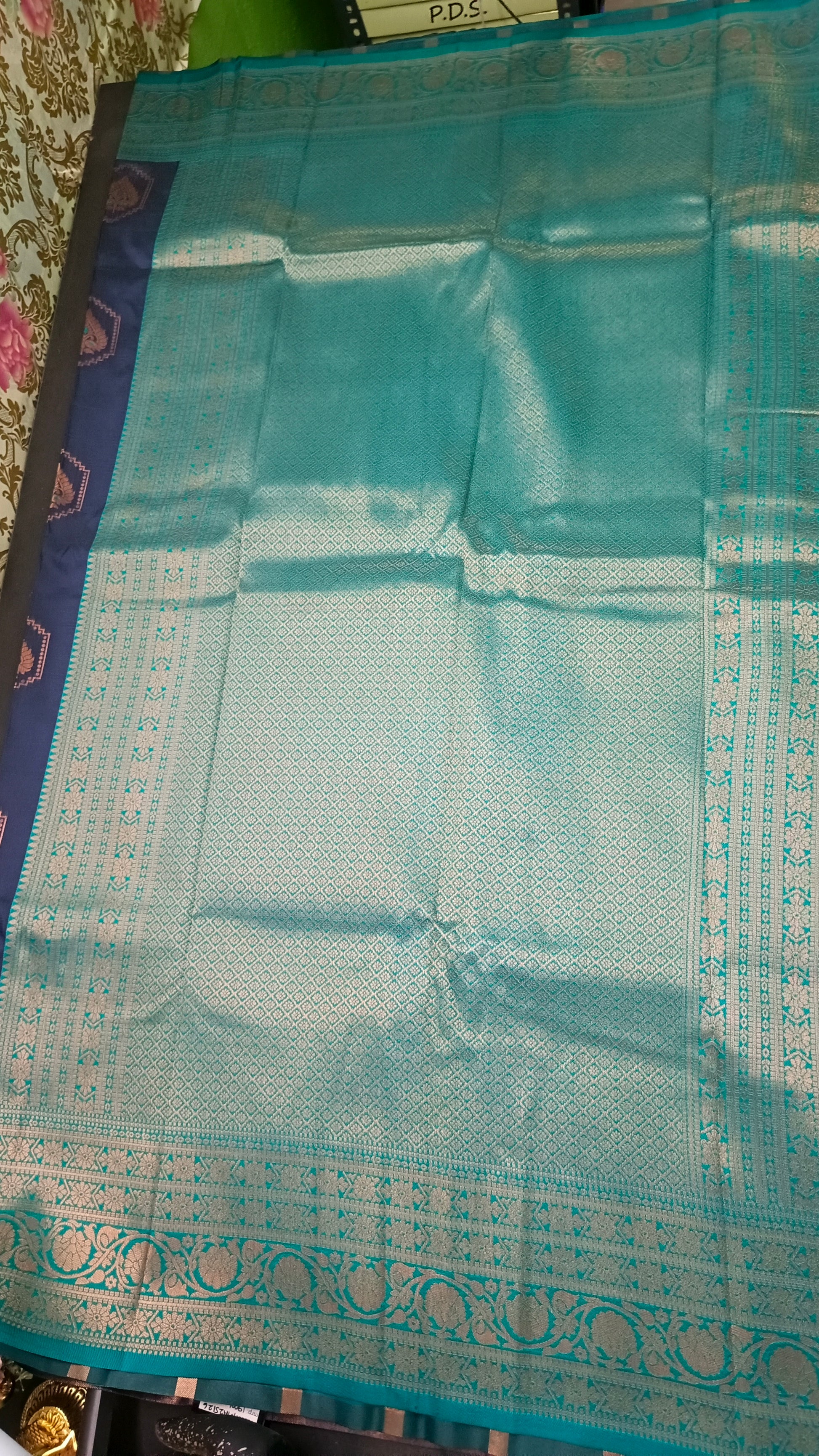 The saree features a striking contrast zari-woven border that frames the drape beautifully, adding depth and regal definition. The rich zari-woven pallu flows with grandeur, making every step look graceful and ceremonial. Delicate yet opulent, intricate zari weaves spread all over the saree create a luminous texture that reflects light and luxury from every angle.