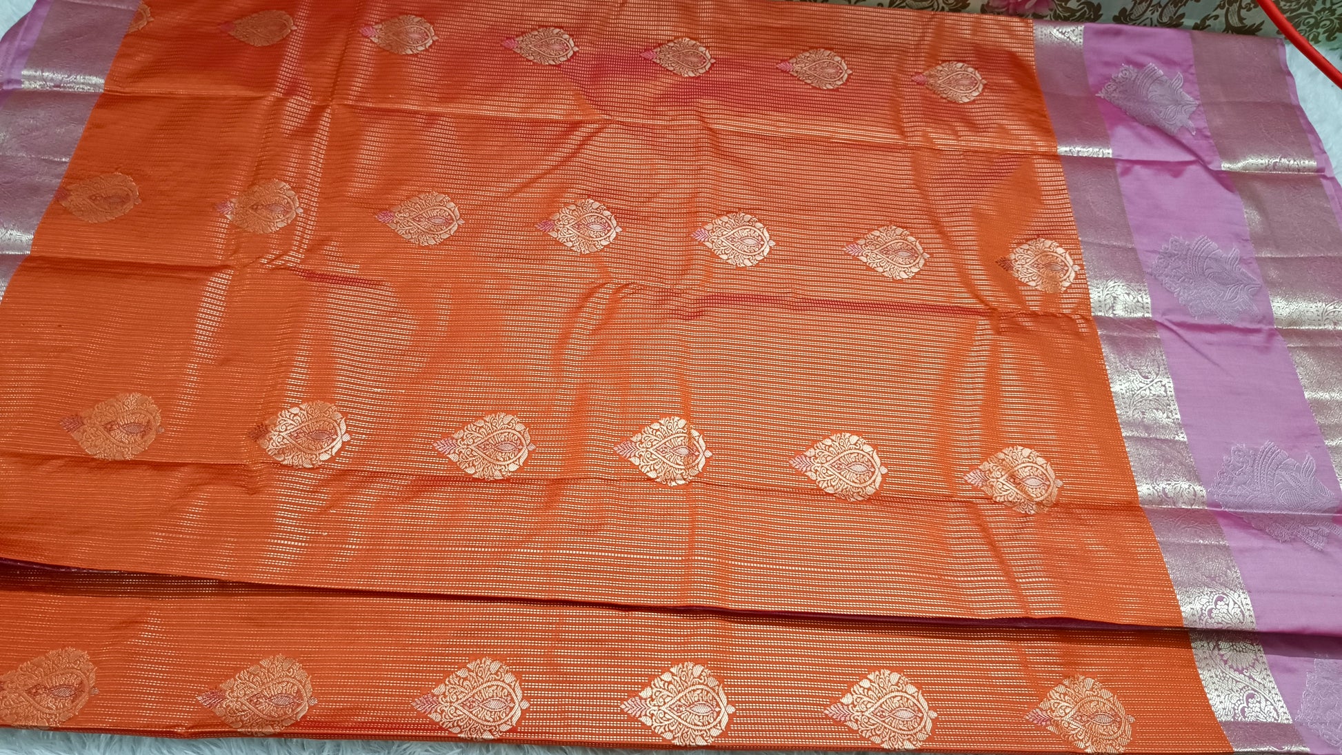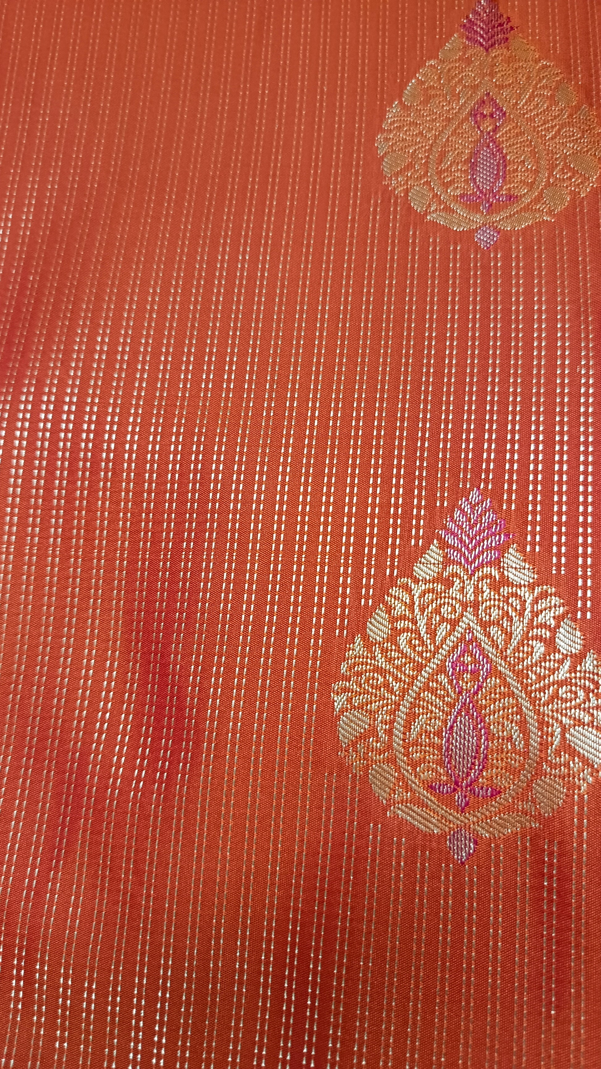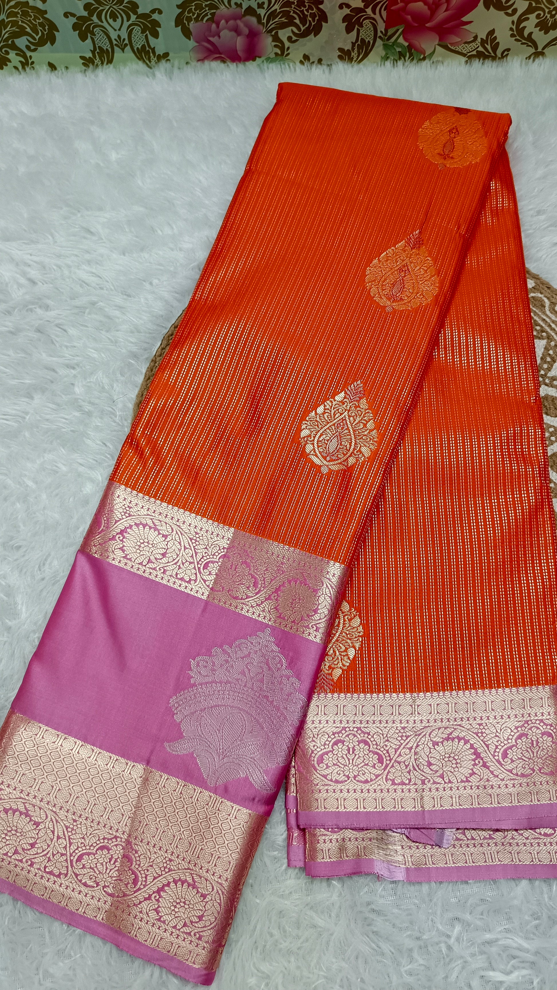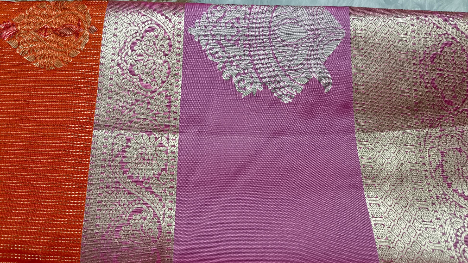 Orange with pastel pink Parijatham Vegan premium kanchi brocade silk saree LA25925