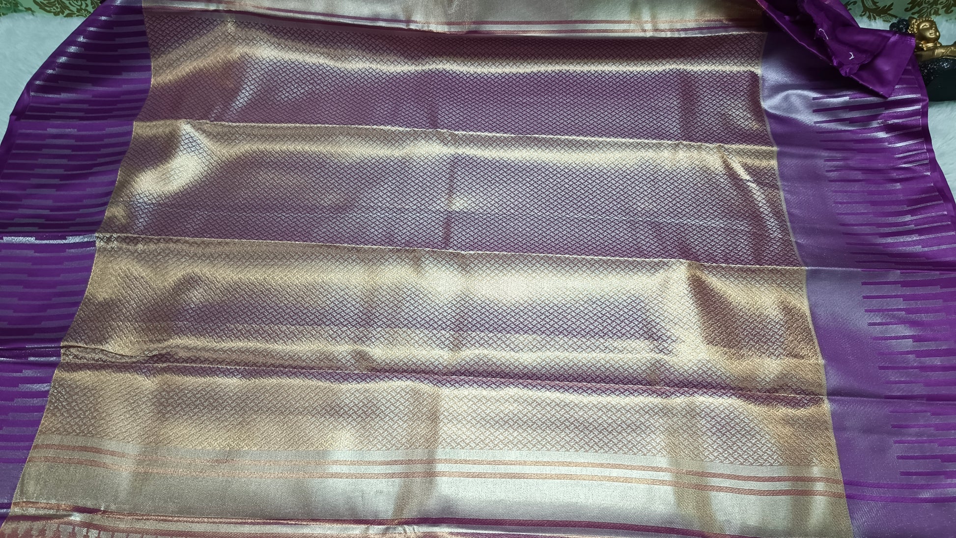 - Style Tips: Pair with Ruby or Amethyst-studded jewelry to complement the purple. Drape the pallu neatly to showcase the bold striped design.