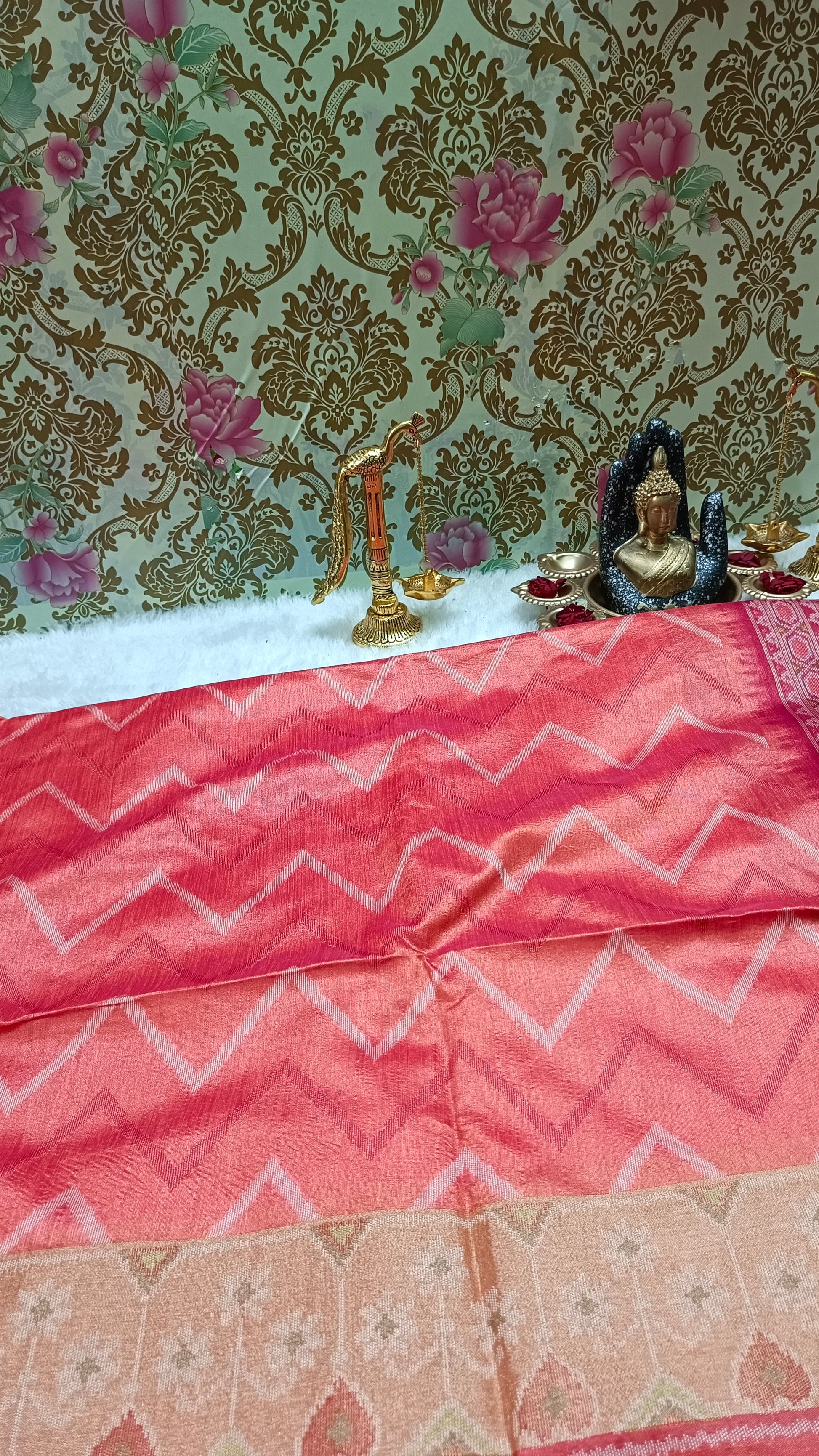 Peach with Pink Zigzag Handweave Ikkat Vegan silk cotton saree HA25431