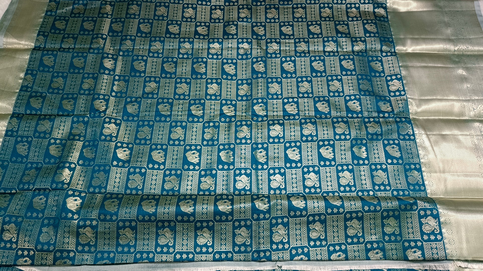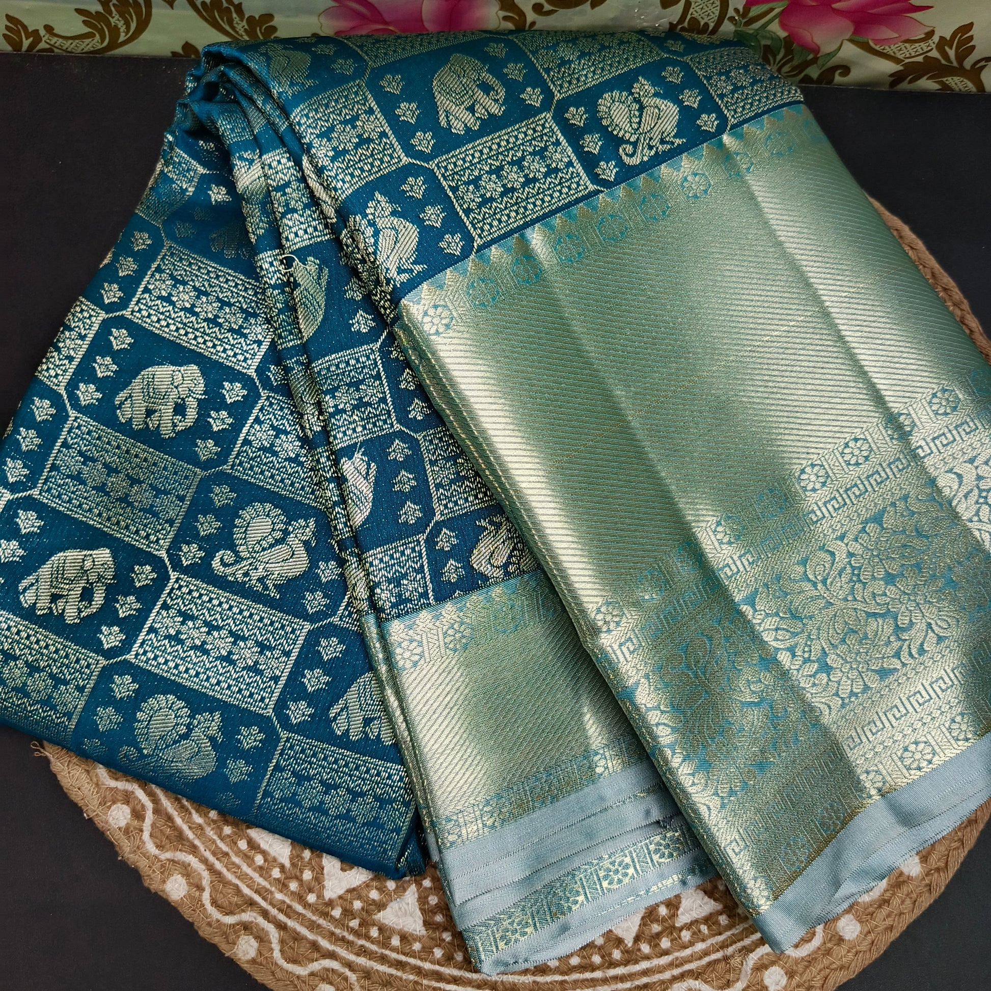 Peacock blue Parijatham Vegan premium kanchi brocade silk saree LA25920