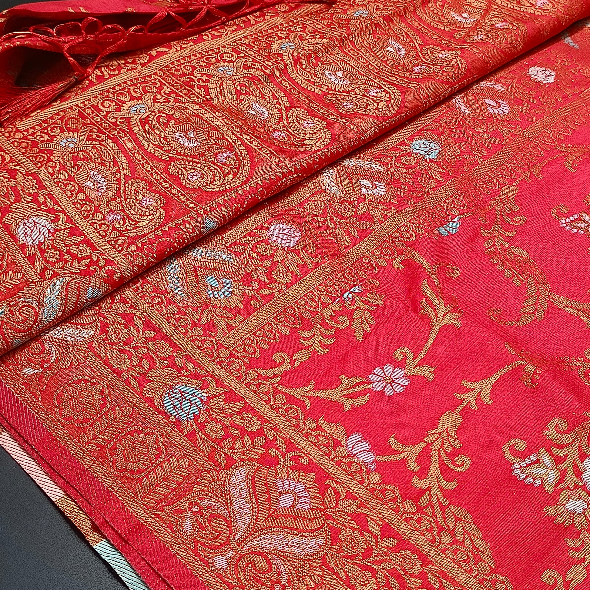Weave: Traditional Kaddi weave structure, interwoven with delicate Jaal and vibrant Meenakari accents.