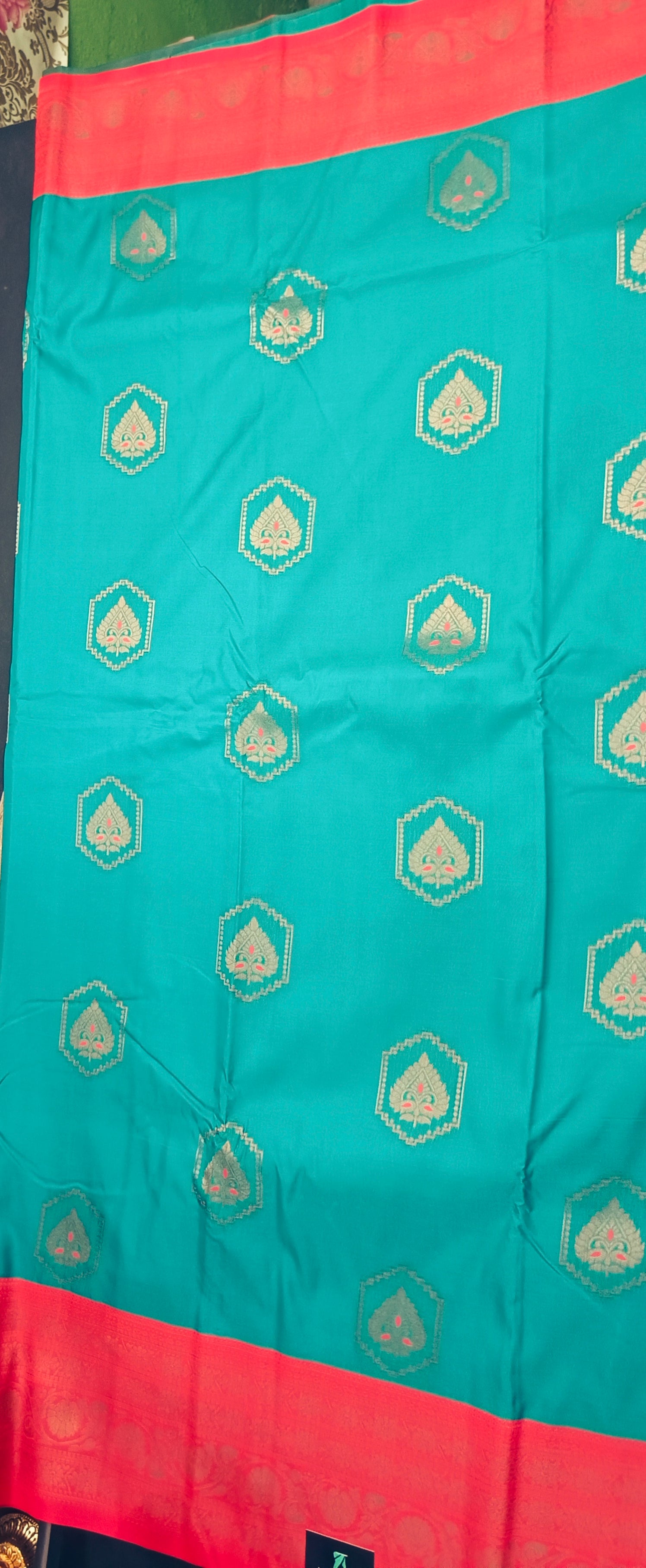The saree features a striking contrast zari-woven border that frames the drape beautifully, adding depth and regal definition. The rich zari-woven pallu flows with grandeur, making every step look graceful and ceremonial. Delicate yet opulent, intricate zari weaves spread all over the saree create a luminous texture that reflects light and luxury from every angle.