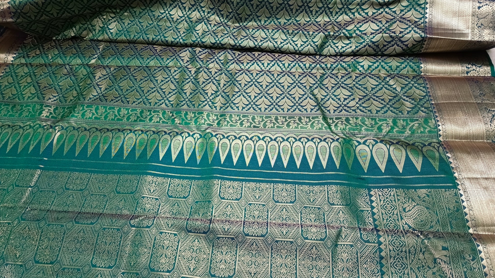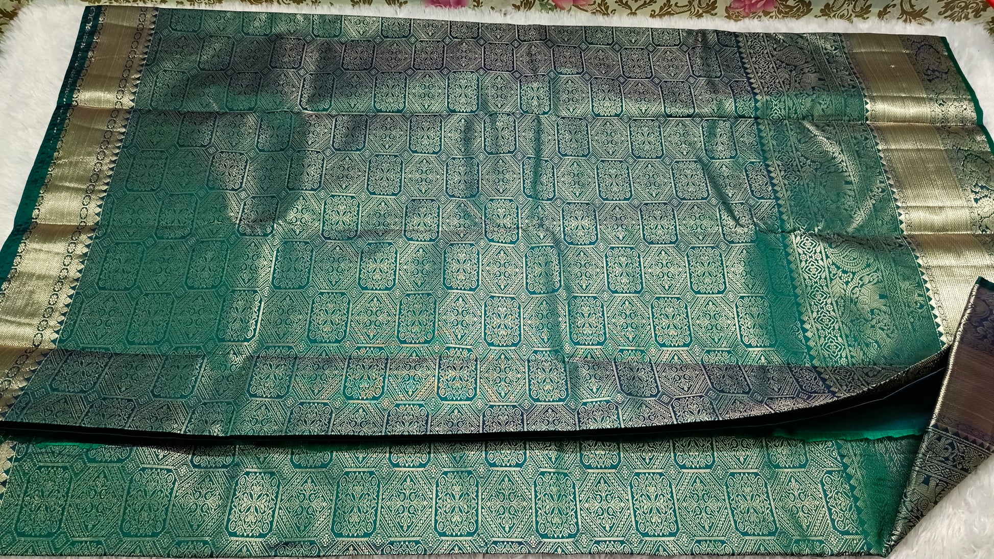 Color Palette: Striking dual-tone of Lustrous Gold (Body) and deep Teal Green/Peacock Blue (Pallu and border).