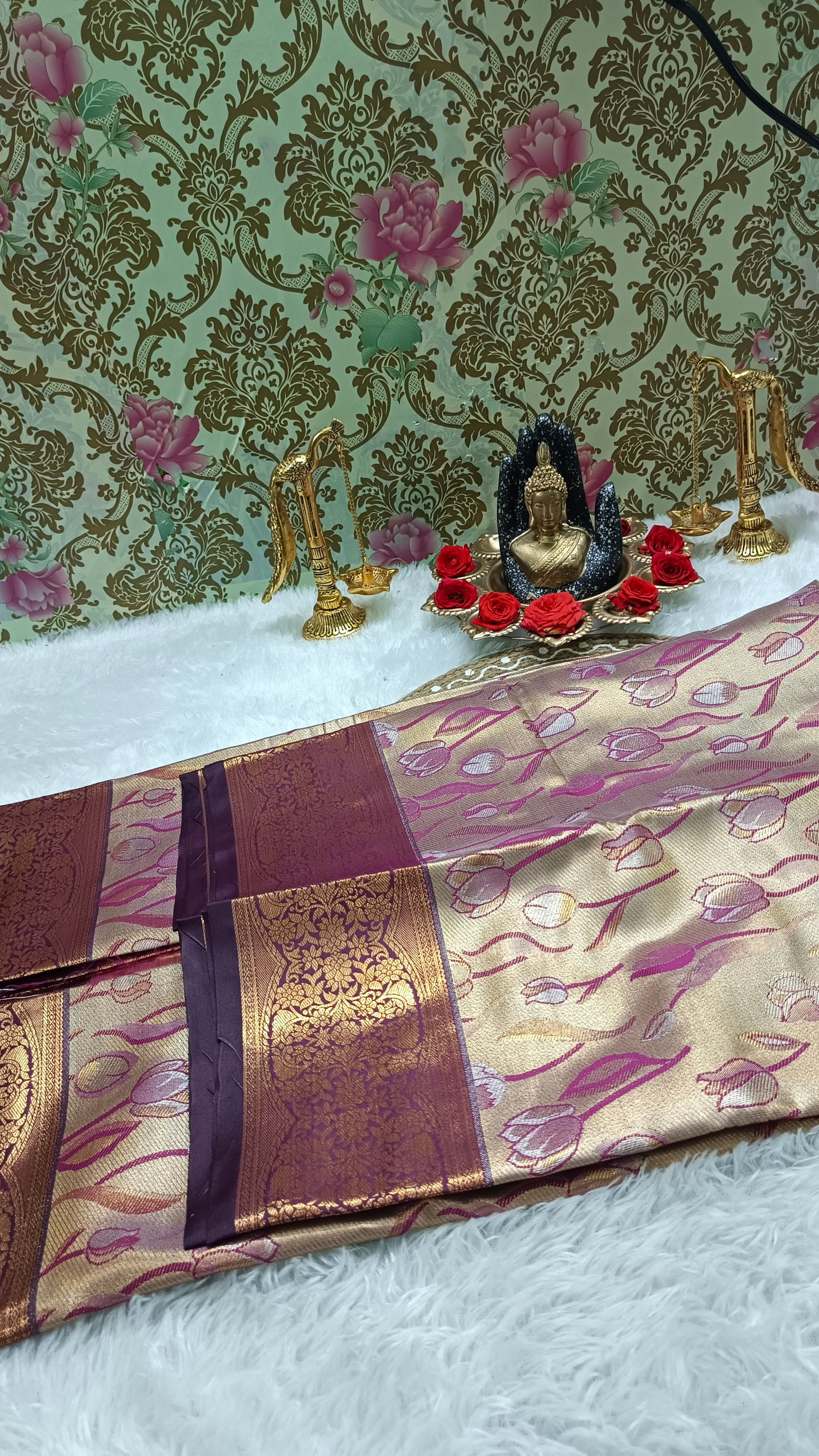 Color: Golden base with green tulip design, wine border & pallu.